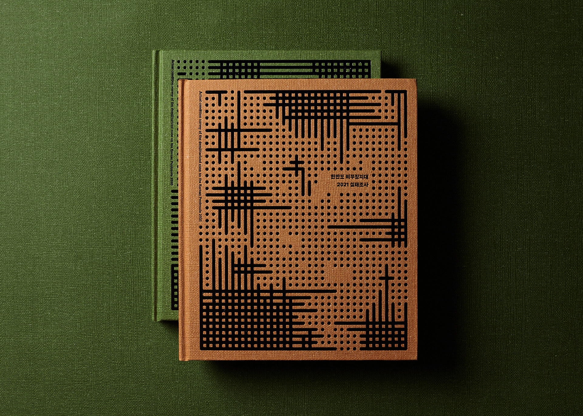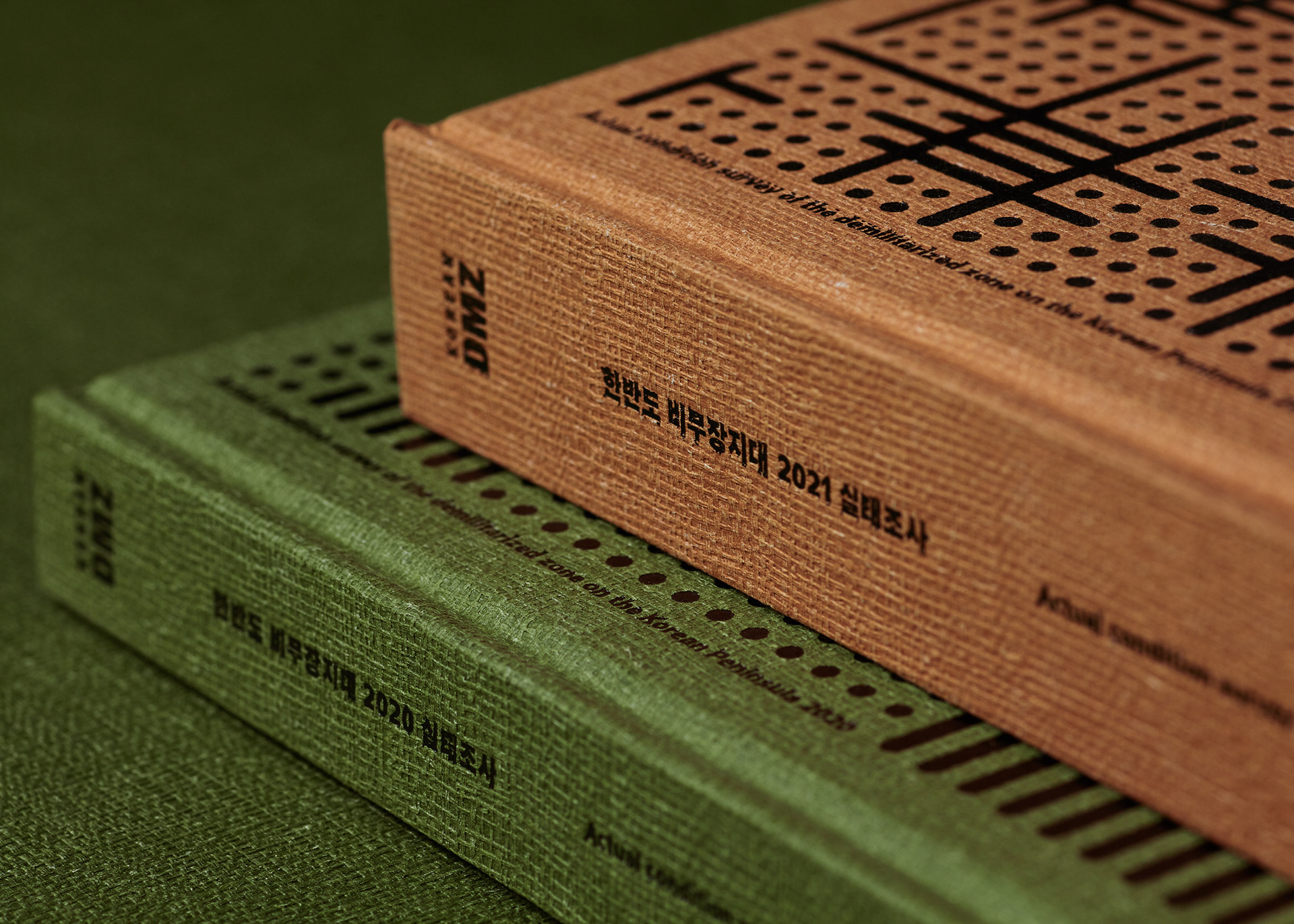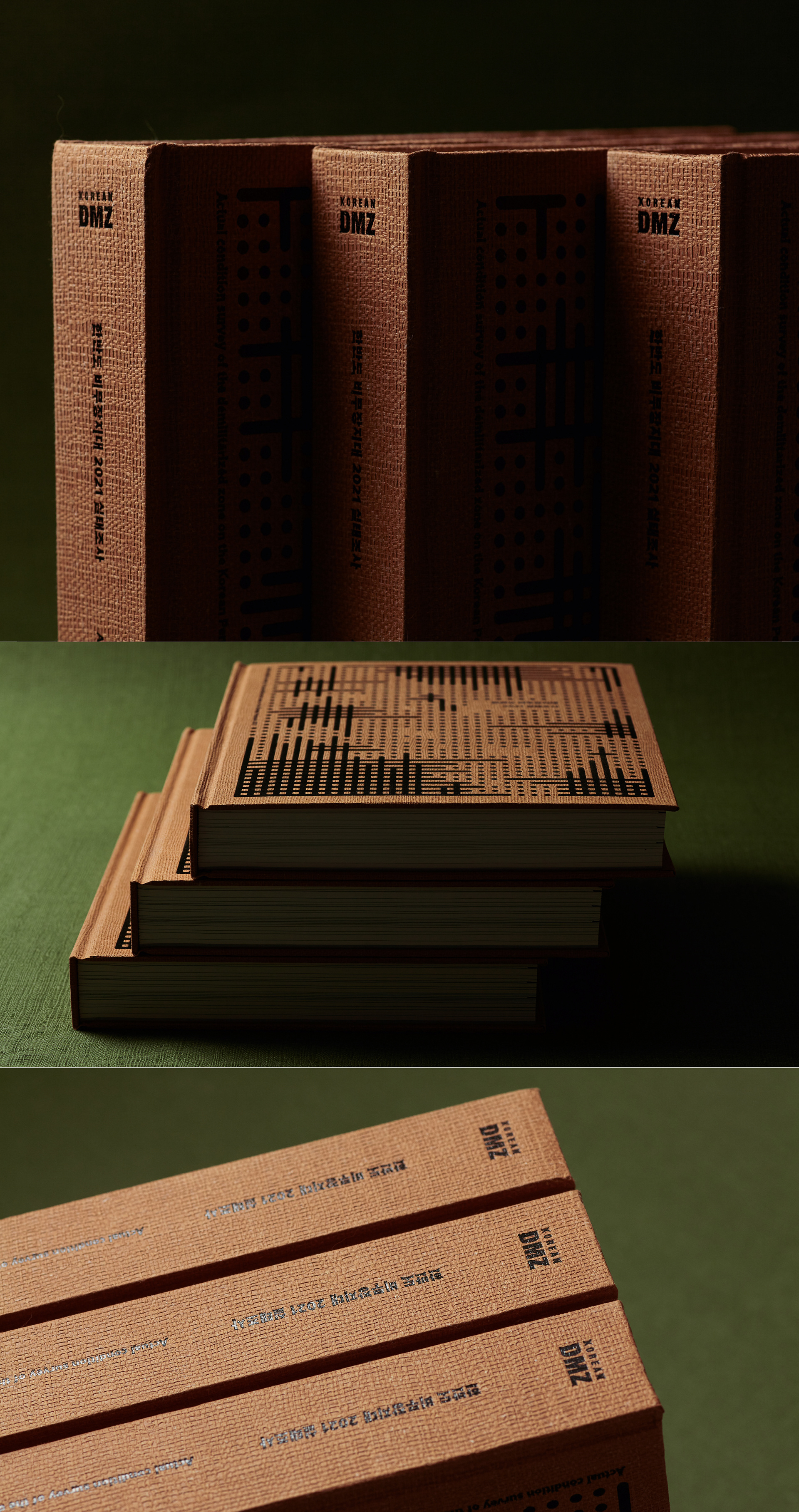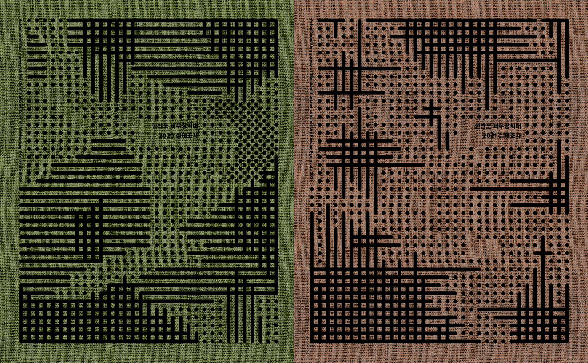 This publication consists of two volumes. The first volume adopts a military green commonly used in standard defense color palettes, while the second uses a brown tone from the same range. The cover graphic is a simplified reinterpretation of a defense camouflage pattern frequently used in military contexts, designed with an expanding structure of dots, lines, and planes. The graphics of the two volumes are conceived to connect with each other, forming a unified symbolic representation of the Korean Demilitarized Zone (DMZ).