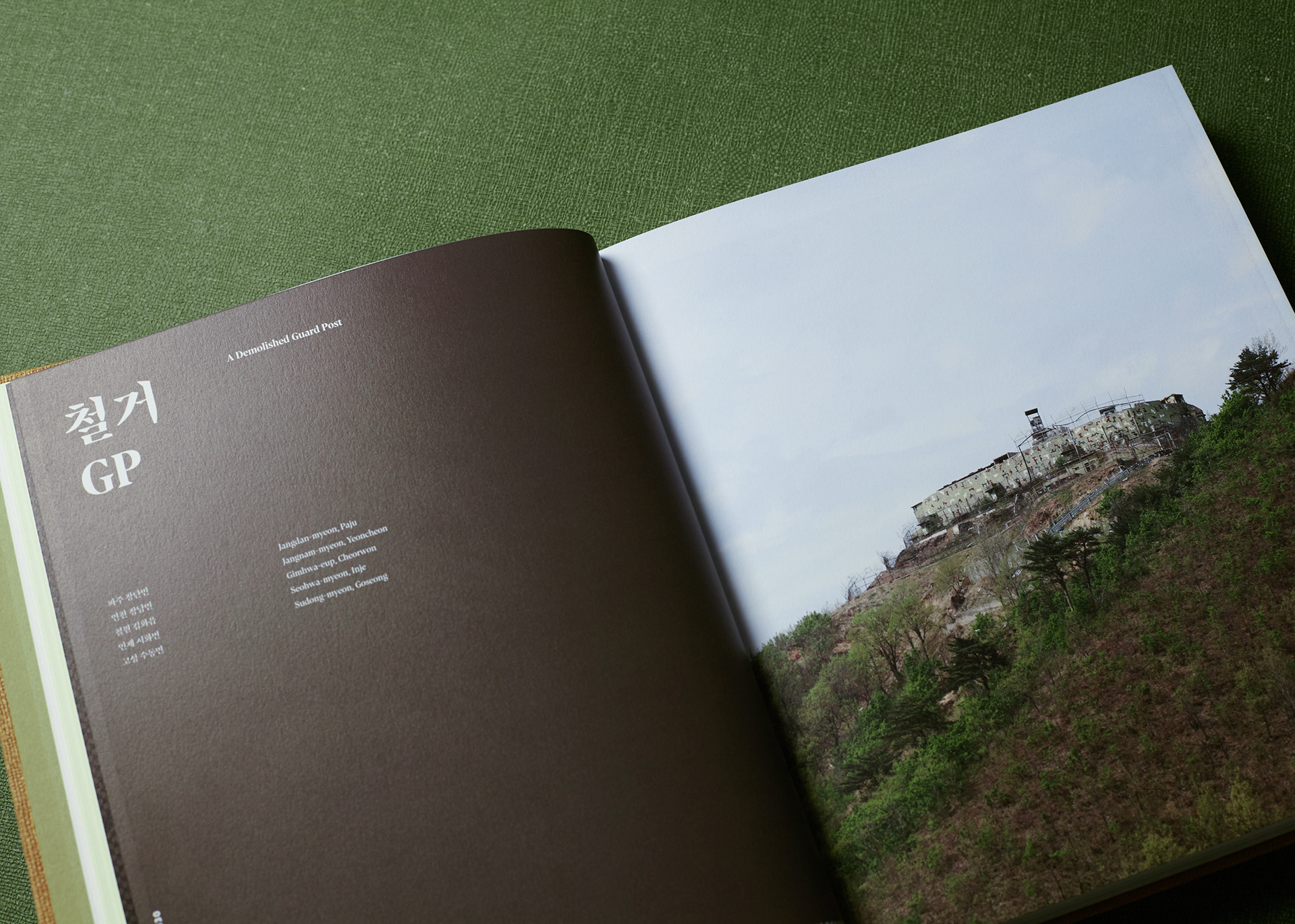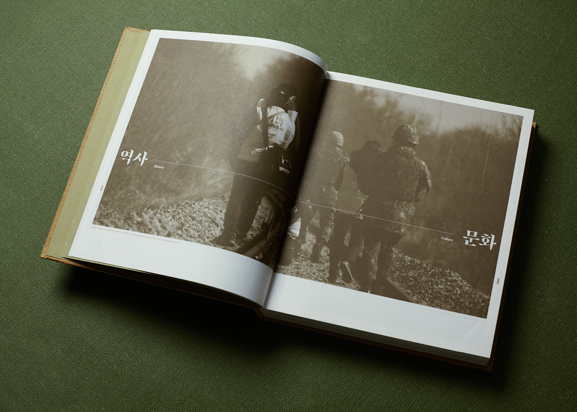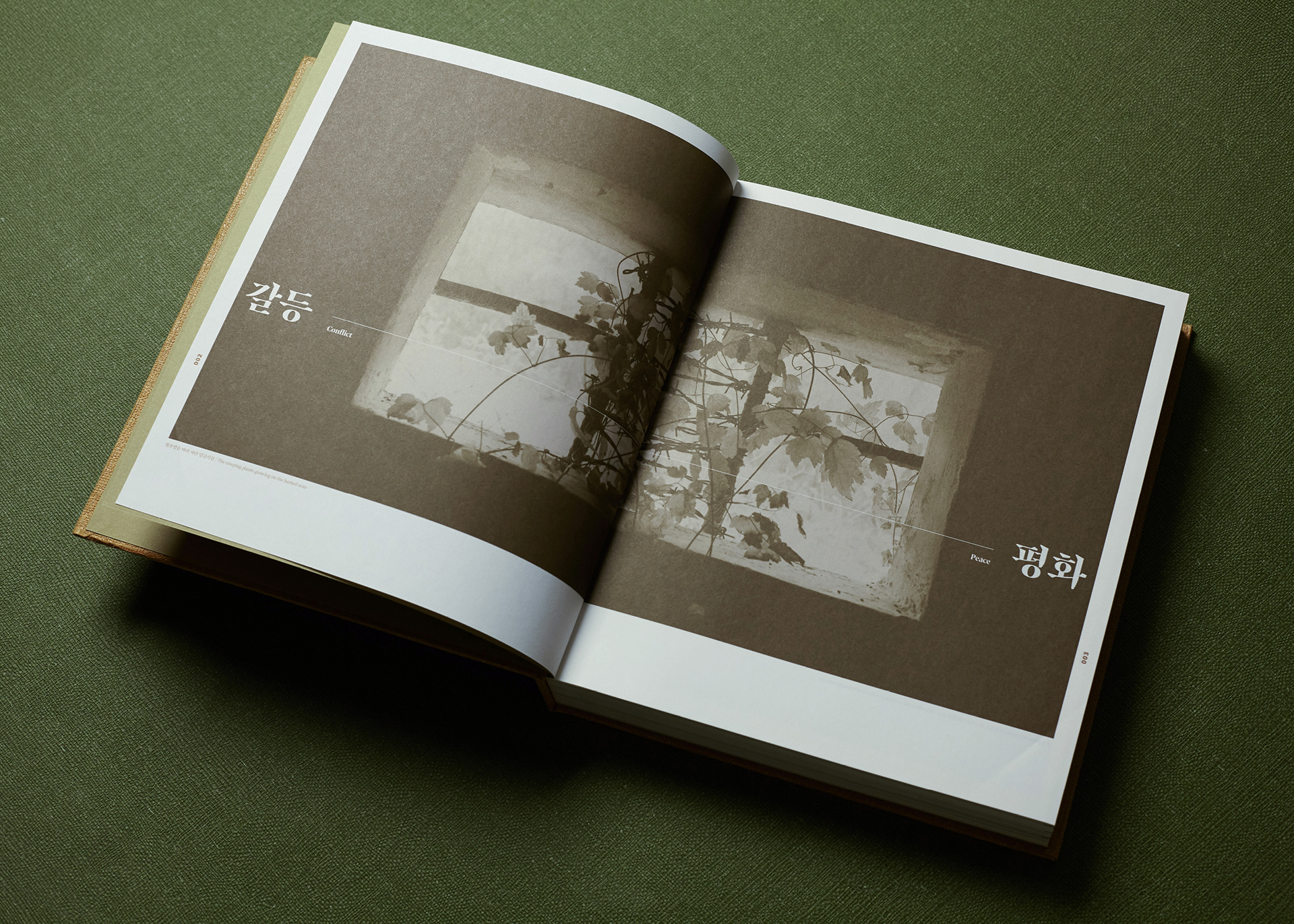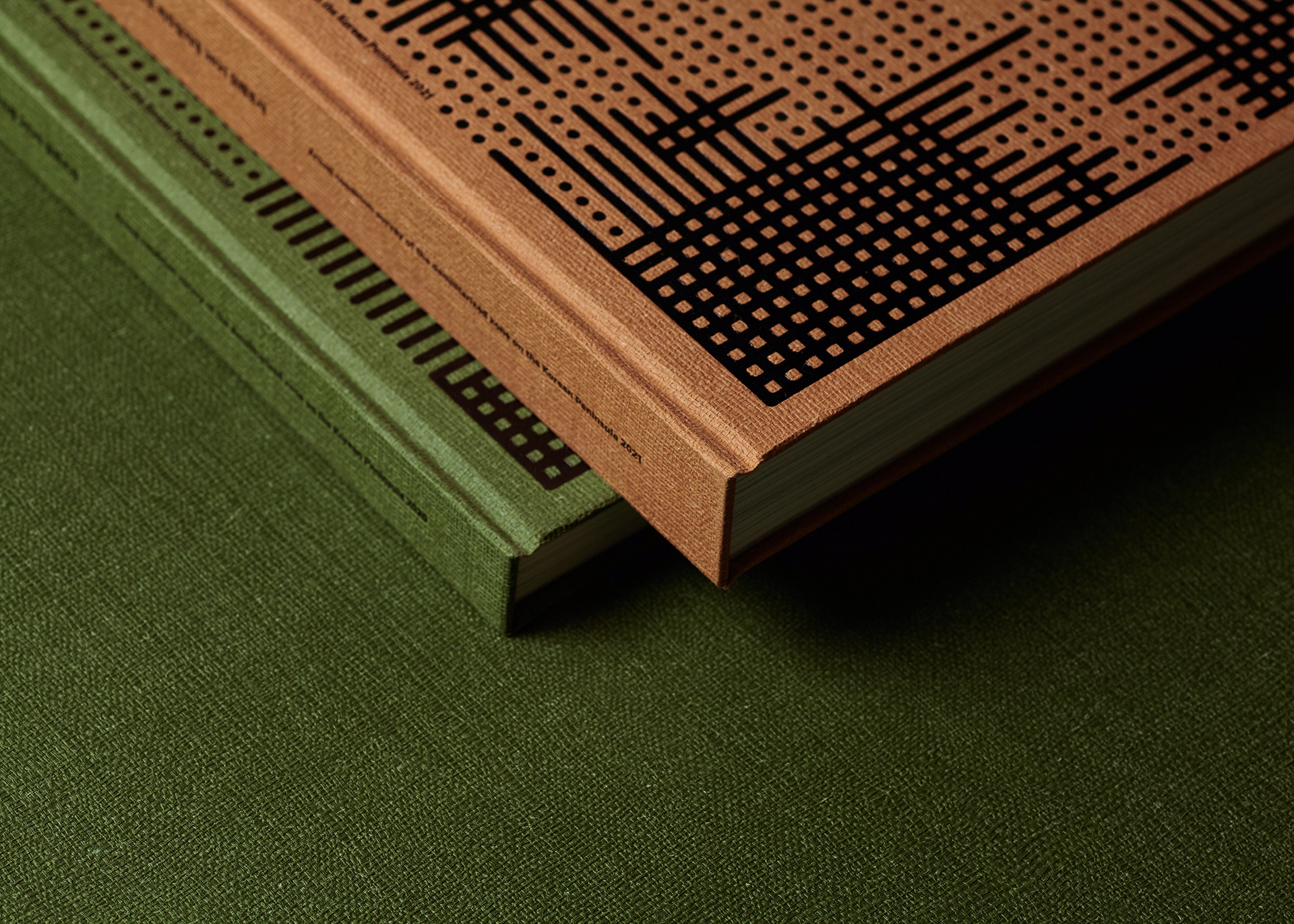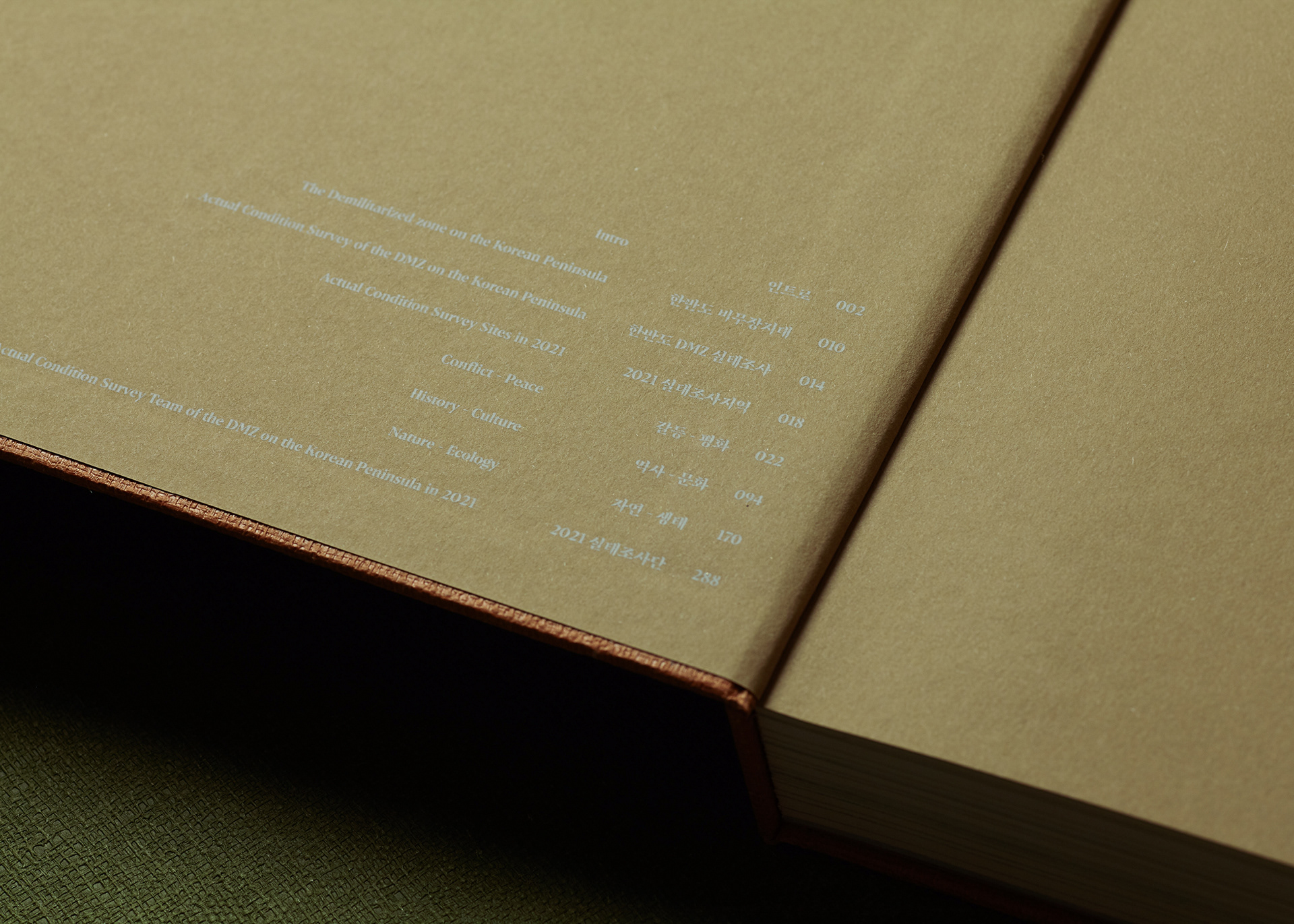 This publication consists of two volumes. The first volume adopts a military green commonly used in standard defense color palettes, while the second uses a brown tone from the same range. The cover graphic is a simplified reinterpretation of a defense camouflage pattern frequently used in military contexts, designed with an expanding structure of dots, lines, and planes. The graphics of the two volumes are conceived to connect with each other, forming a unified symbolic representation of the Korean Demilitarized Zone (DMZ).