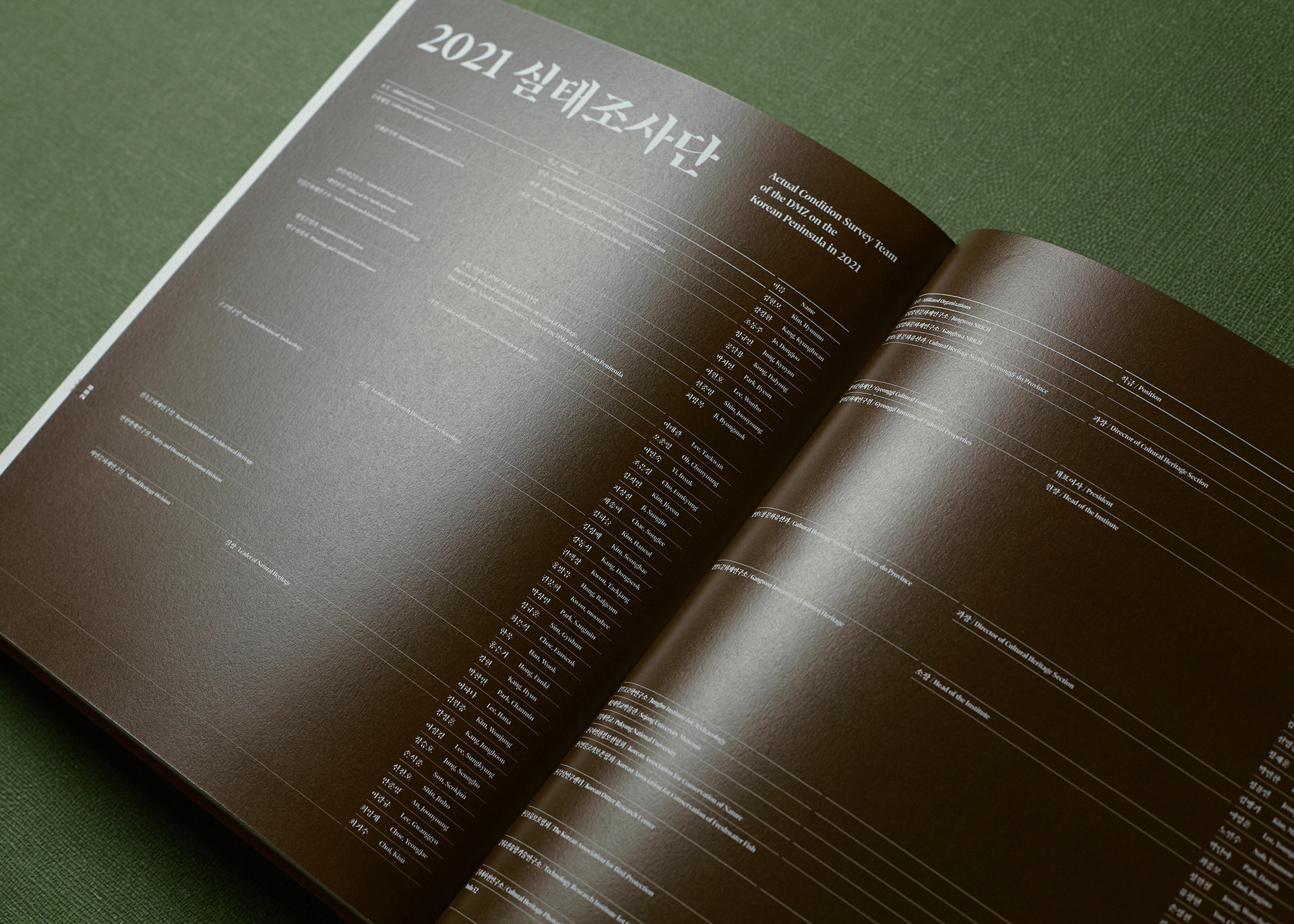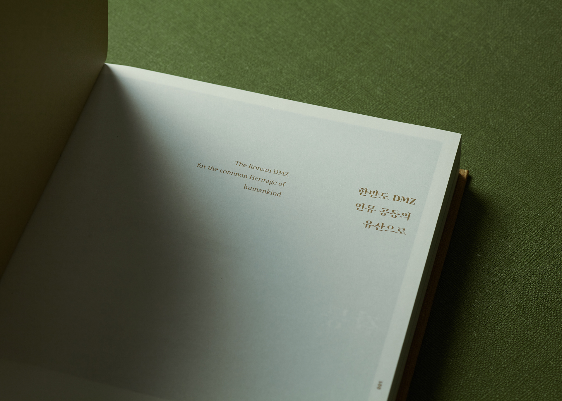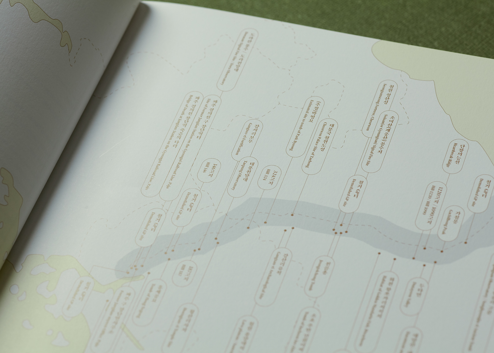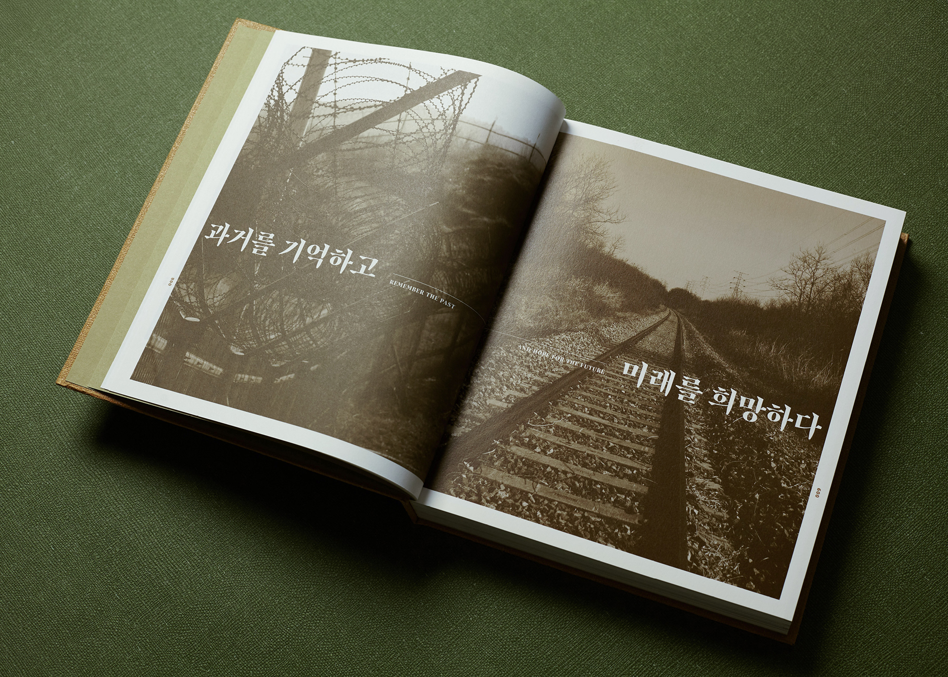 This publication consists of two volumes. The first volume adopts a military green commonly used in standard defense color palettes, while the second uses a brown tone from the same range. The cover graphic is a simplified reinterpretation of a defense camouflage pattern frequently used in military contexts, designed with an expanding structure of dots, lines, and planes. The graphics of the two volumes are conceived to connect with each other, forming a unified symbolic representation of the Korean Demilitarized Zone (DMZ).