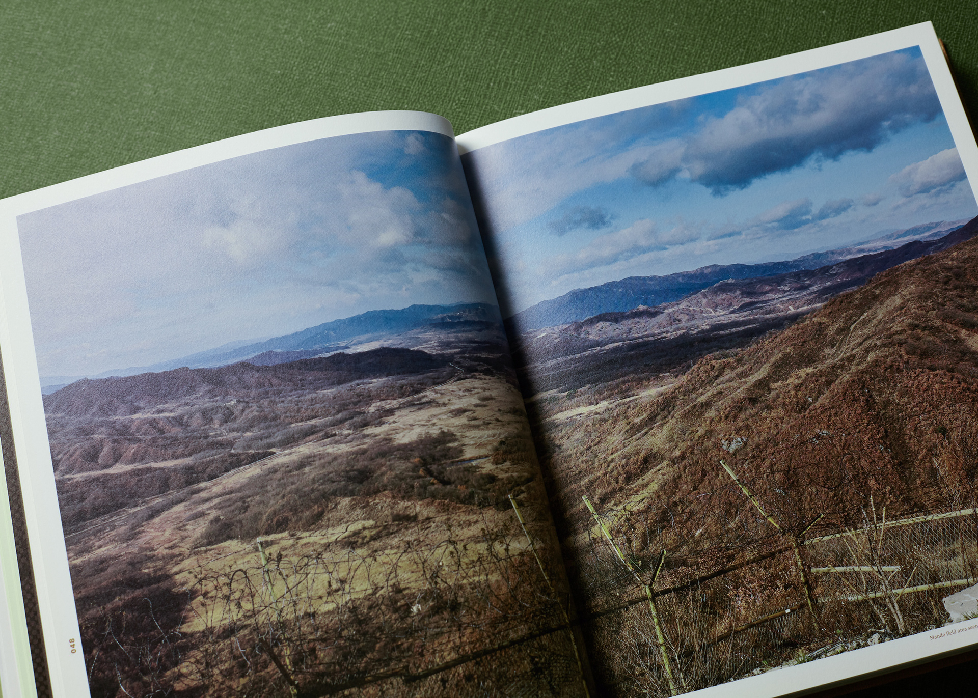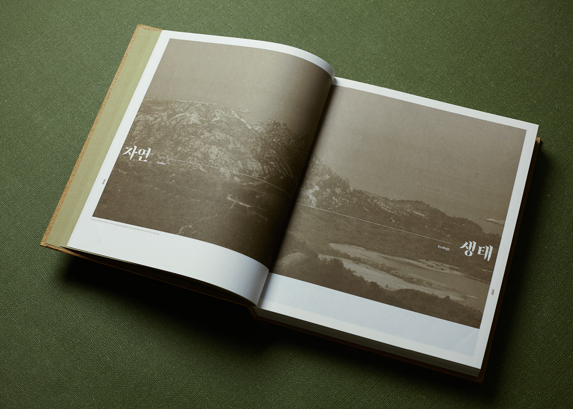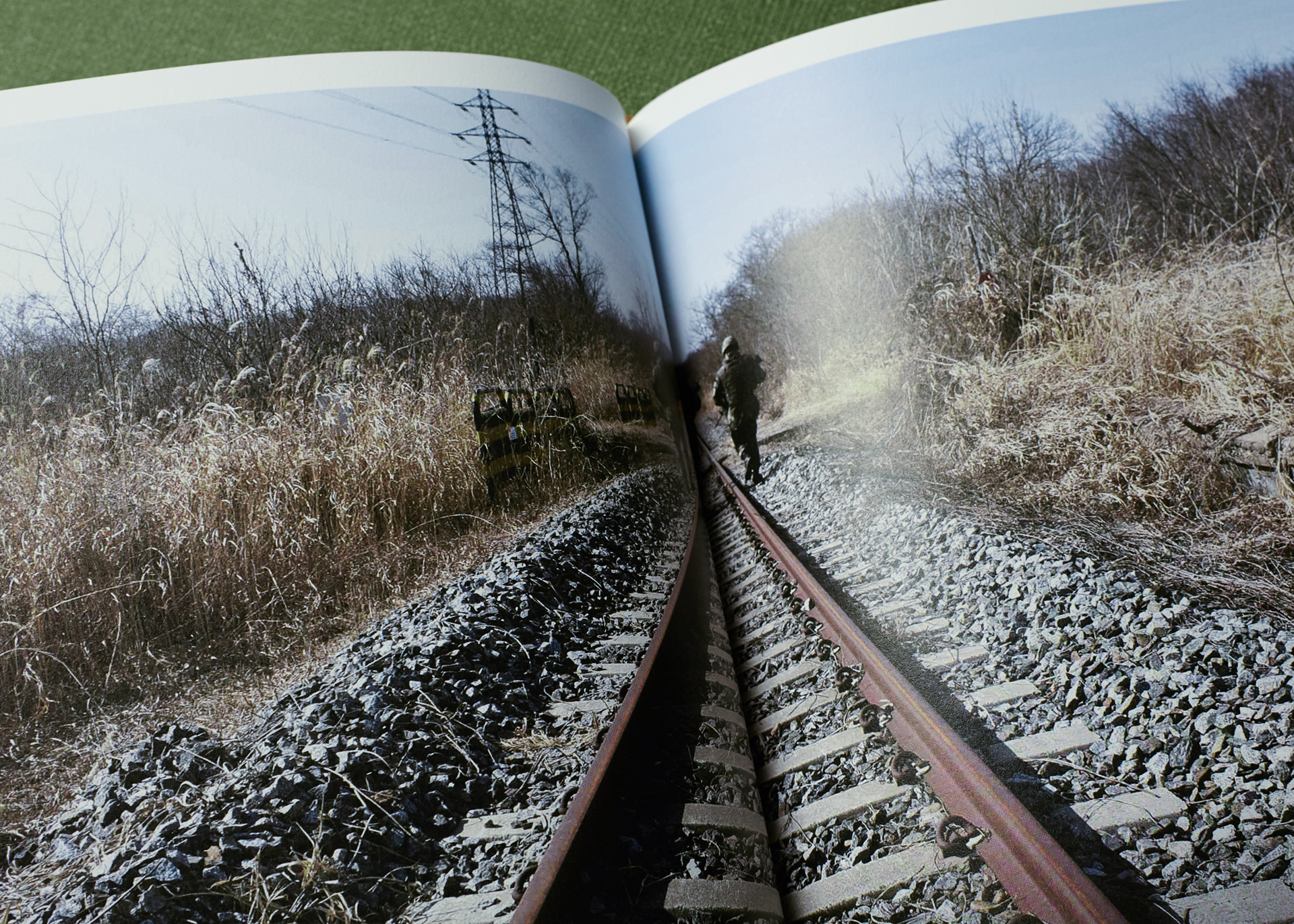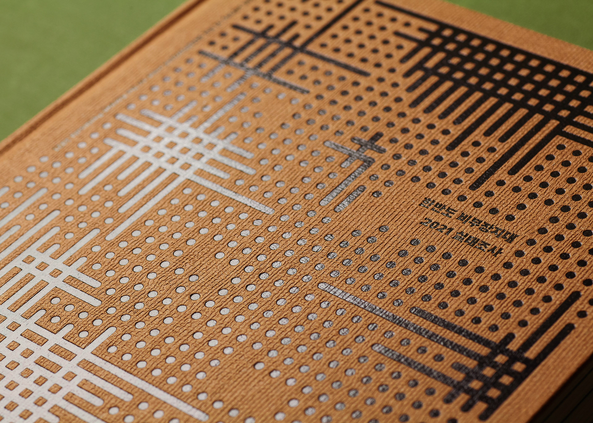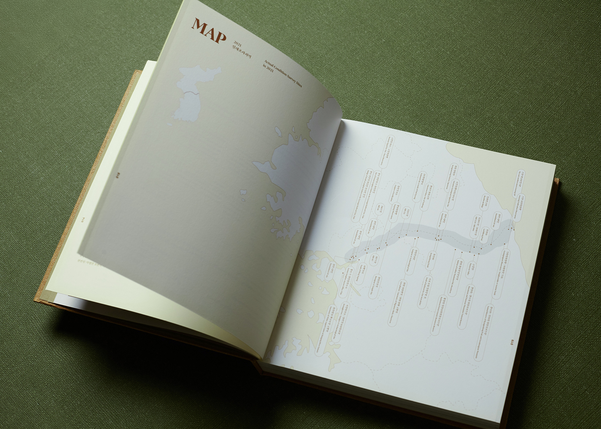 This publication consists of two volumes. The first volume adopts a military green commonly used in standard defense color palettes, while the second uses a brown tone from the same range. The cover graphic is a simplified reinterpretation of a defense camouflage pattern frequently used in military contexts, designed with an expanding structure of dots, lines, and planes. The graphics of the two volumes are conceived to connect with each other, forming a unified symbolic representation of the Korean Demilitarized Zone (DMZ).