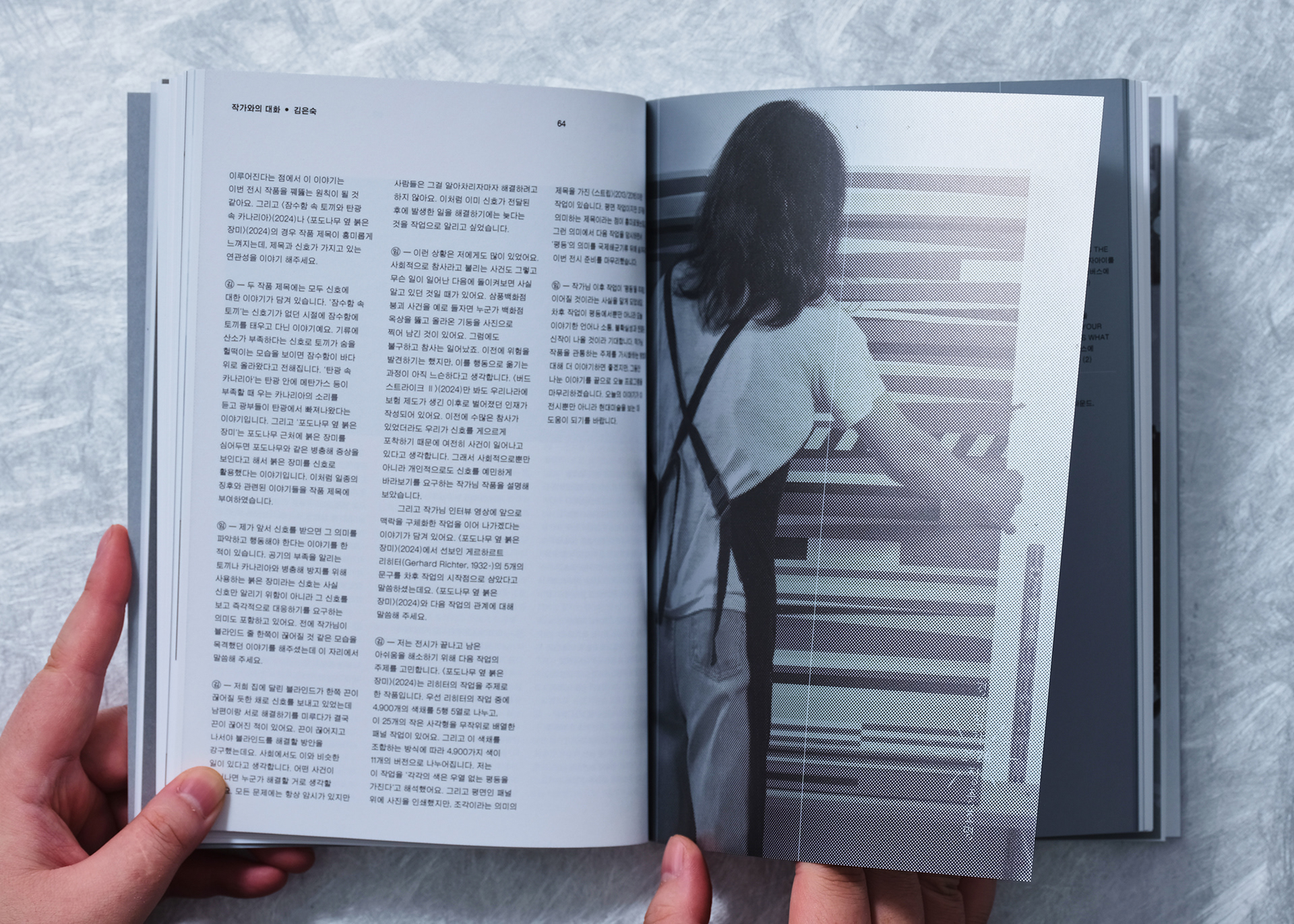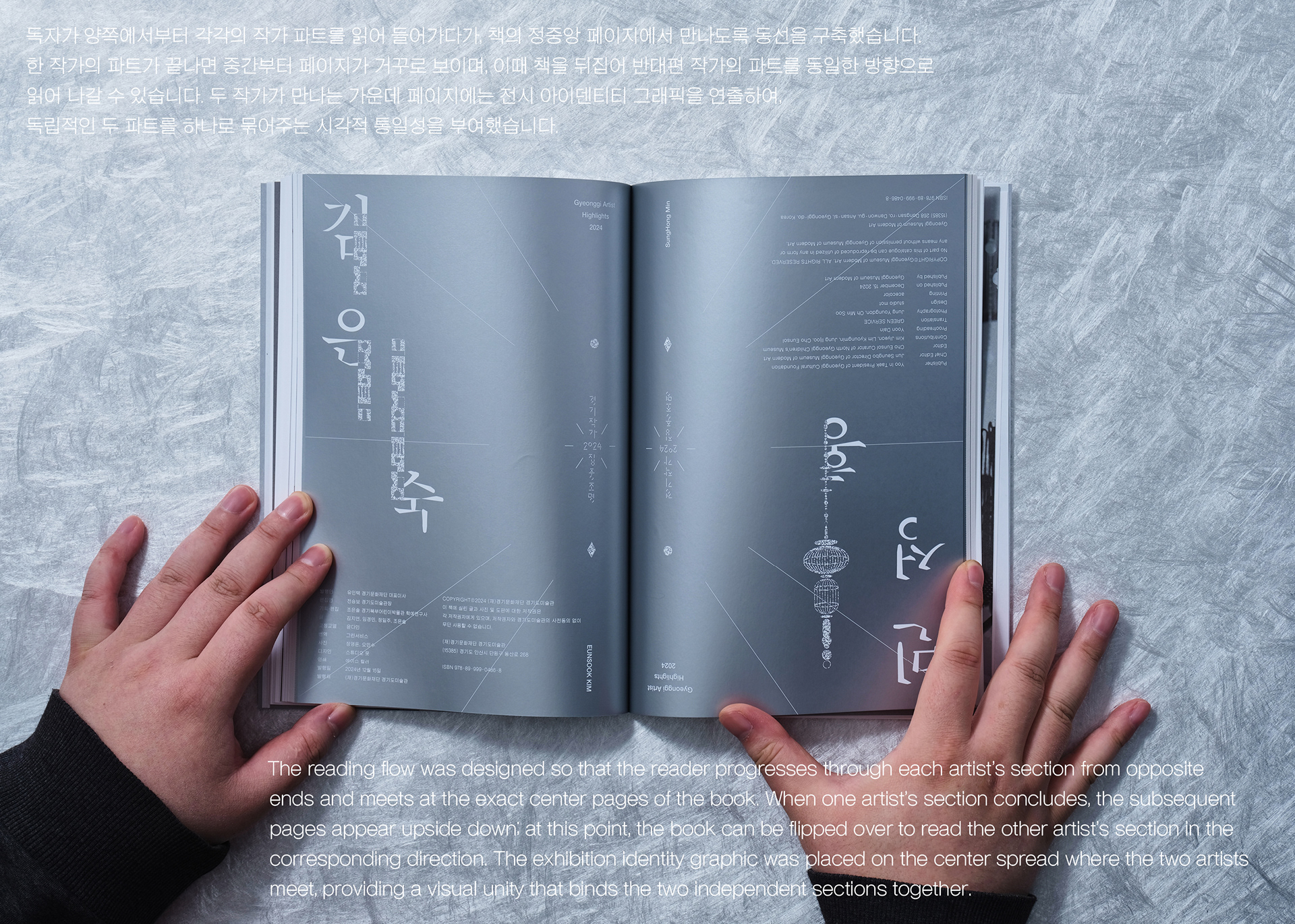 독자가 양쪽에서부터 각각의 작가 파트를 읽어 들어가다가, 책의 정중앙 페이지에서 만나도록 동선을 구축했습니다. 한 작가의 파트가 끝나면 중간부터 페이지가 거꾸로 보이며, 이때 책을 뒤집어 반대편 작가의 파트를 동일한 방향으로 읽어 나갈 수 있습니다. 두 작가가 만나는 가운데 페이지에는 전시 아이덴티티 그래픽을 연출하여, 독립적인 두 파트를 하나로 묶어주는 시각적 통일성을 부여했습니다.