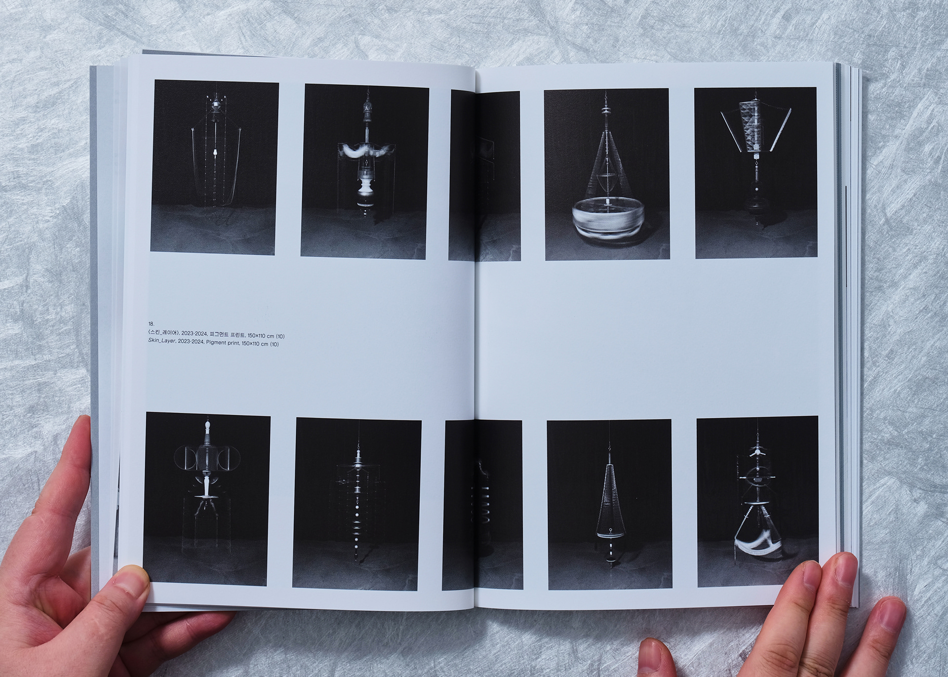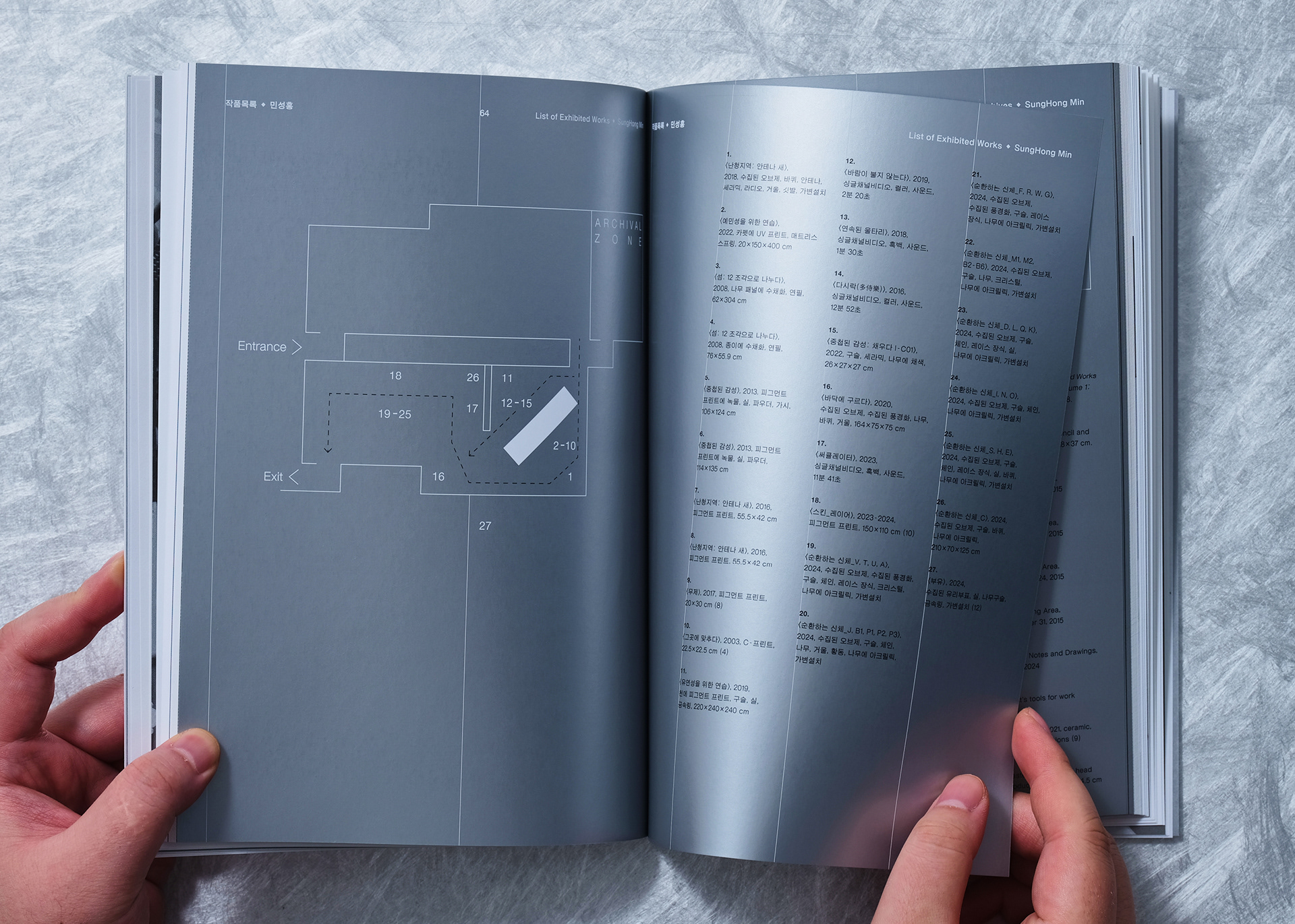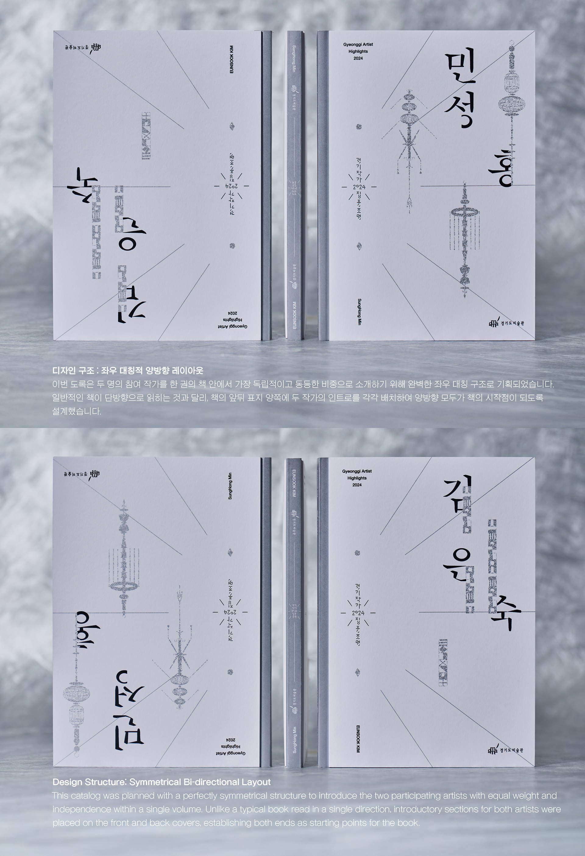 This catalog was planned with a perfectly symmetrical structure to introduce the two participating artists with equal weight and independence within a single volume. Unlike a typical book read in a single direction, introductory sections for both artists were placed on the front and back covers, establishing both ends as starting points for the book.