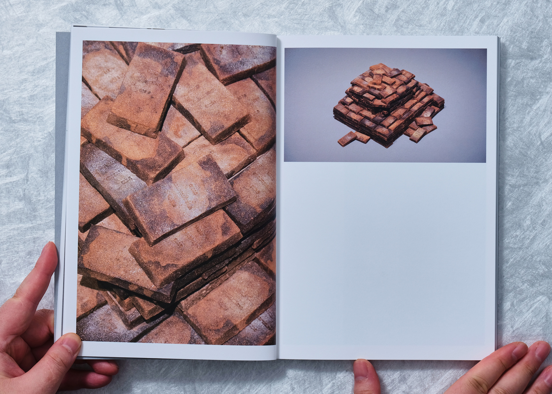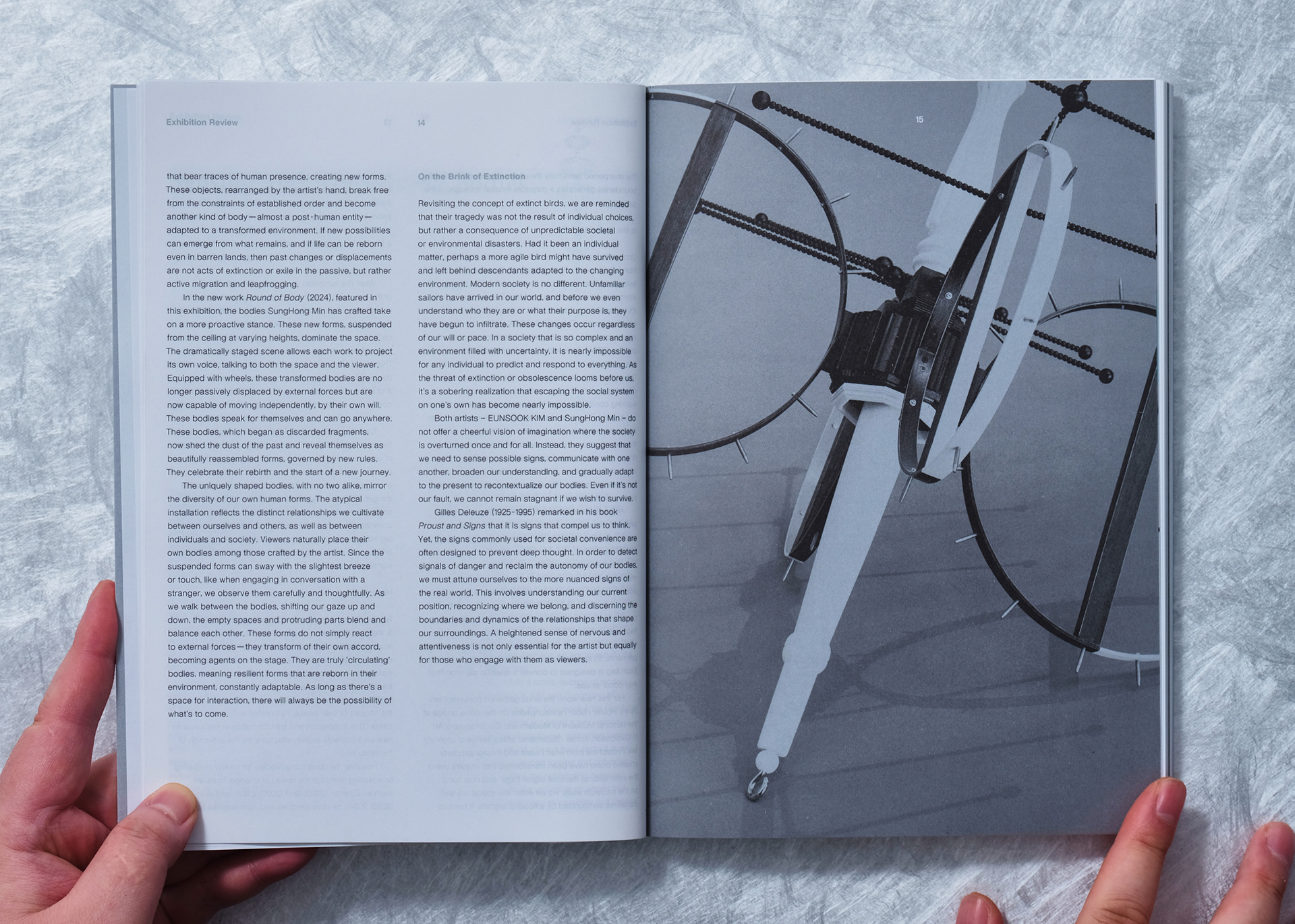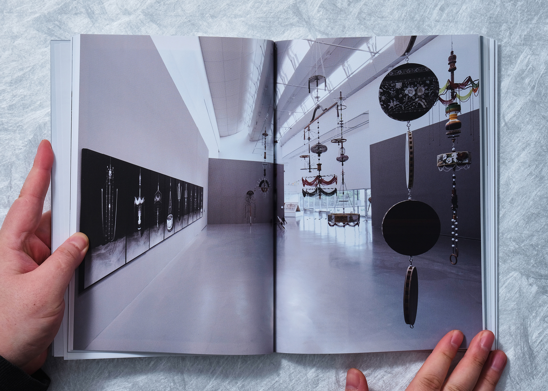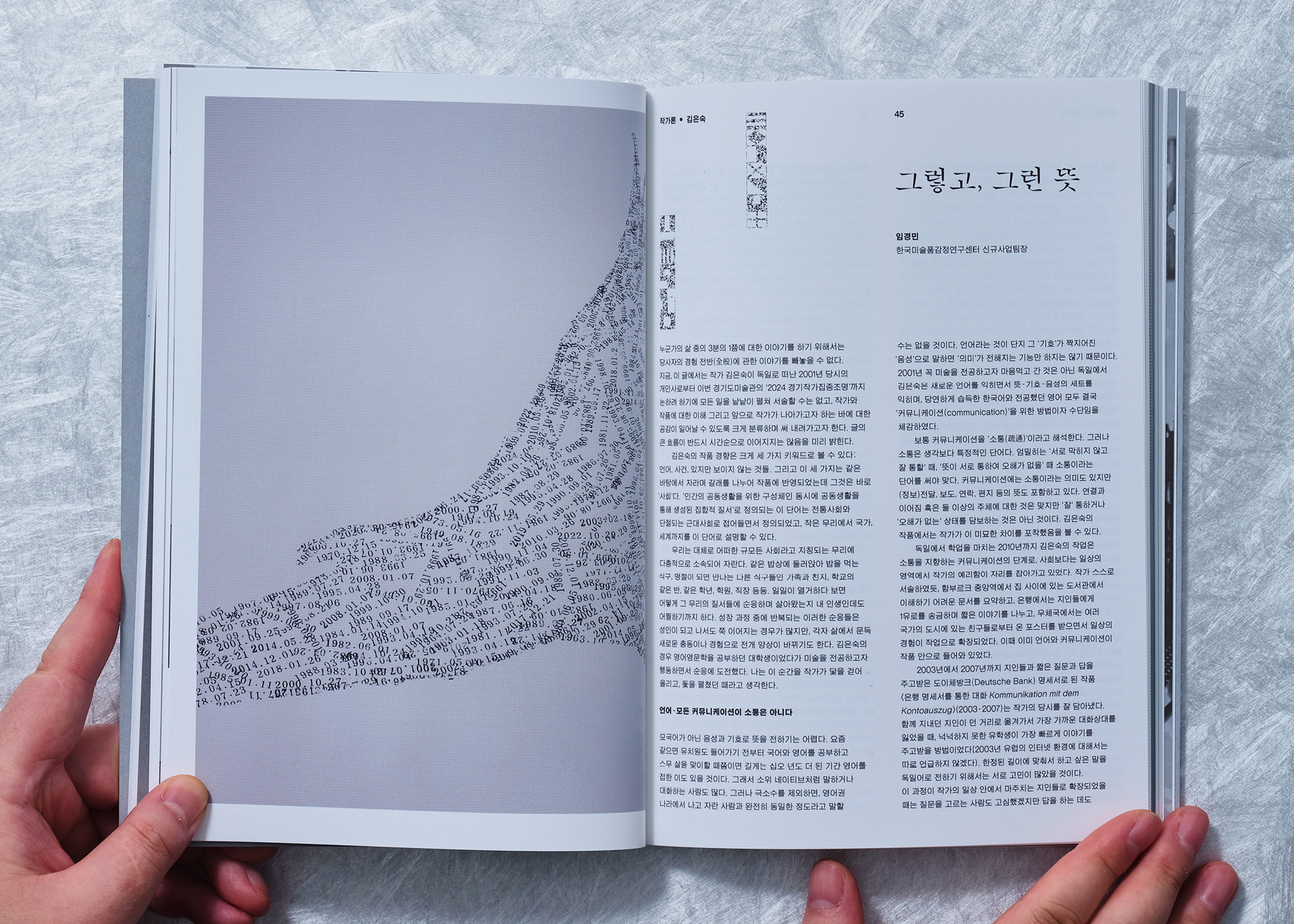 This catalog was planned with a perfectly symmetrical structure to introduce the two participating artists with equal weight and independence within a single volume. Unlike a typical book read in a single direction, introductory sections for both artists were placed on the front and back covers, establishing both ends as starting points for the book.