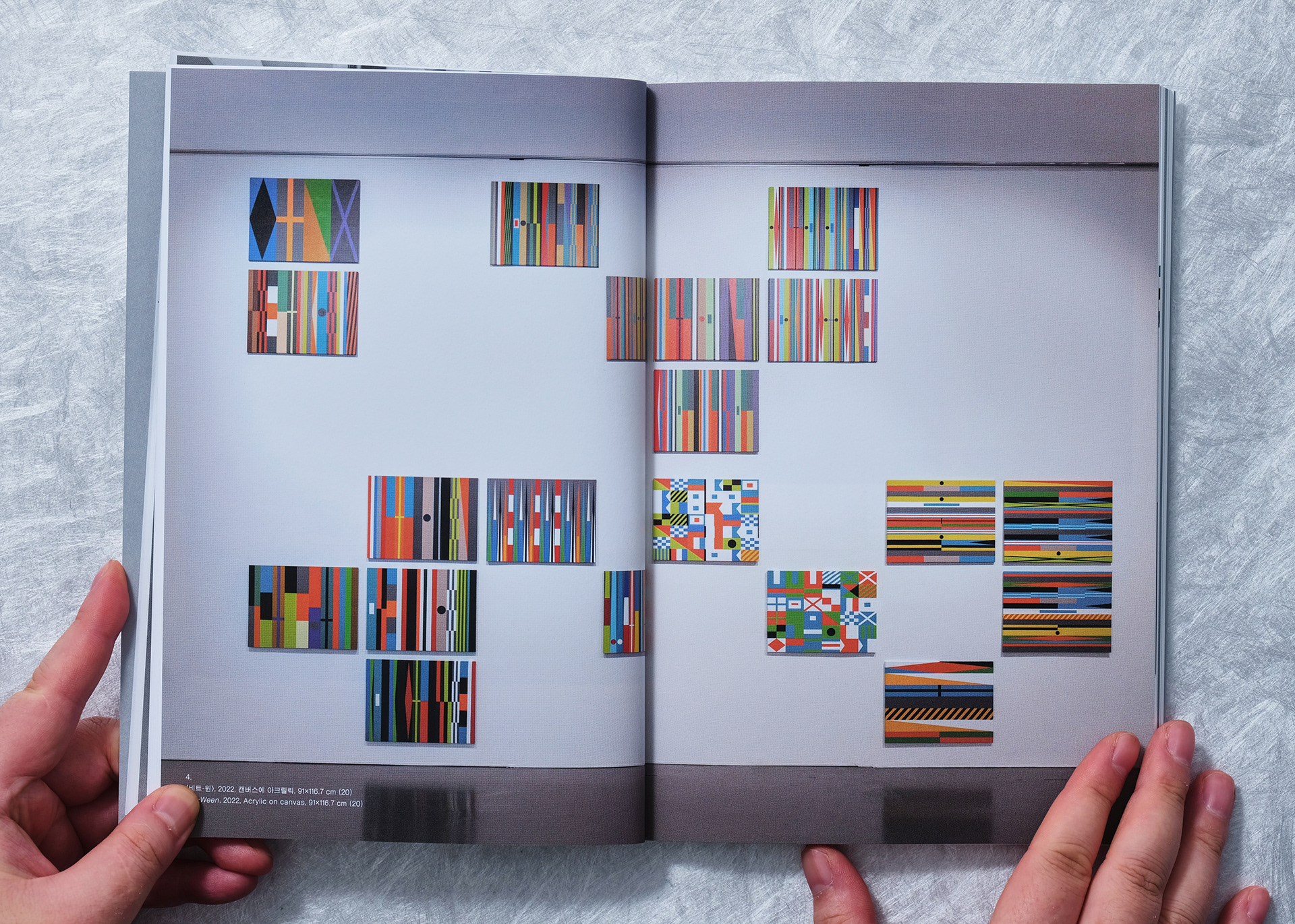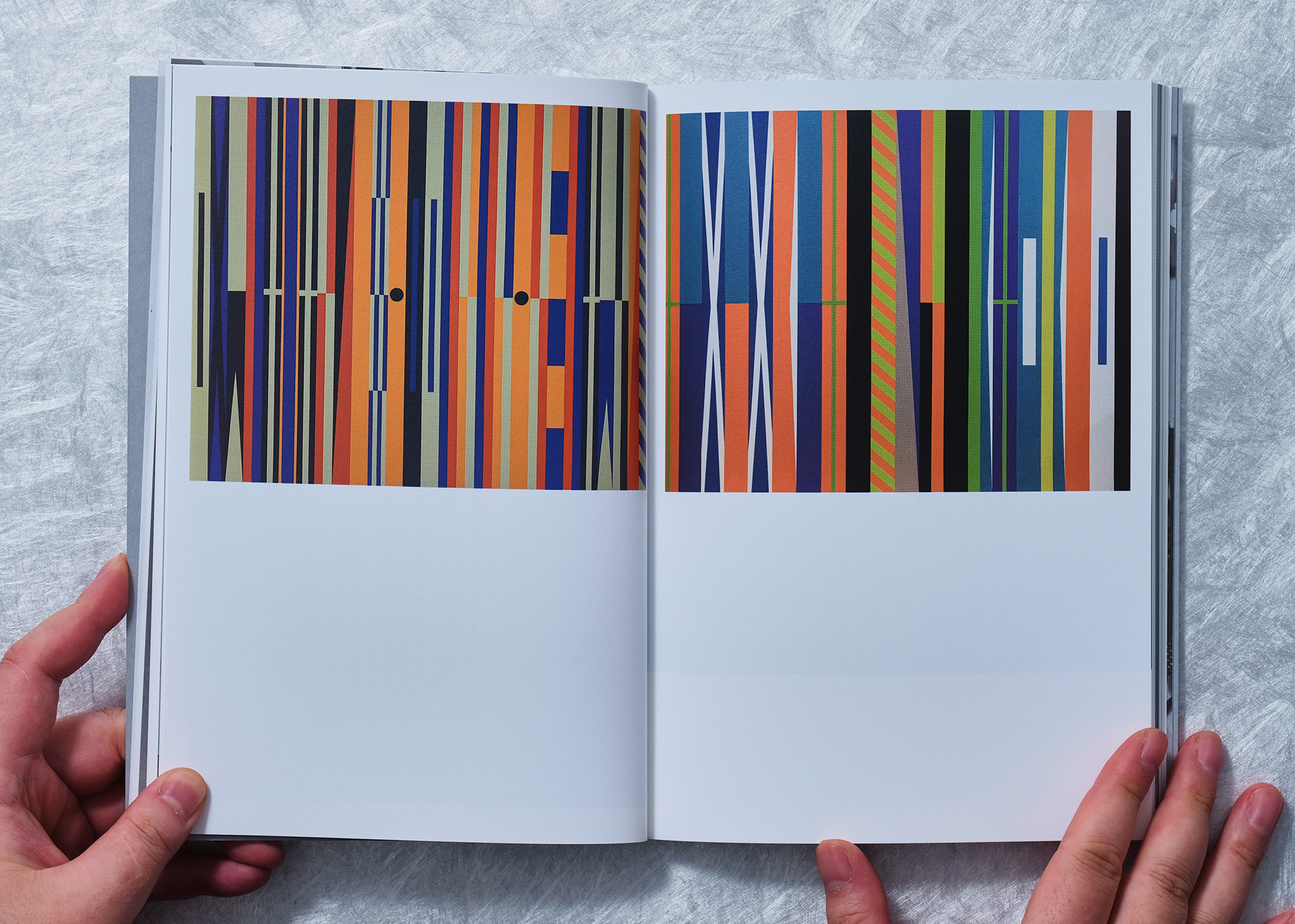 The reading flow was designed so that the reader progresses through each artist’s section from opposite ends and meets at the exact center pages of the book. When one artist’s section concludes, the subsequent pages appear upside down; at this point, the book can be flipped over to read the other artist’s section in the corresponding direction. The exhibition identity graphic was placed on the center spread where the two artists meet, providing a visual unity that binds the two independent sections together.