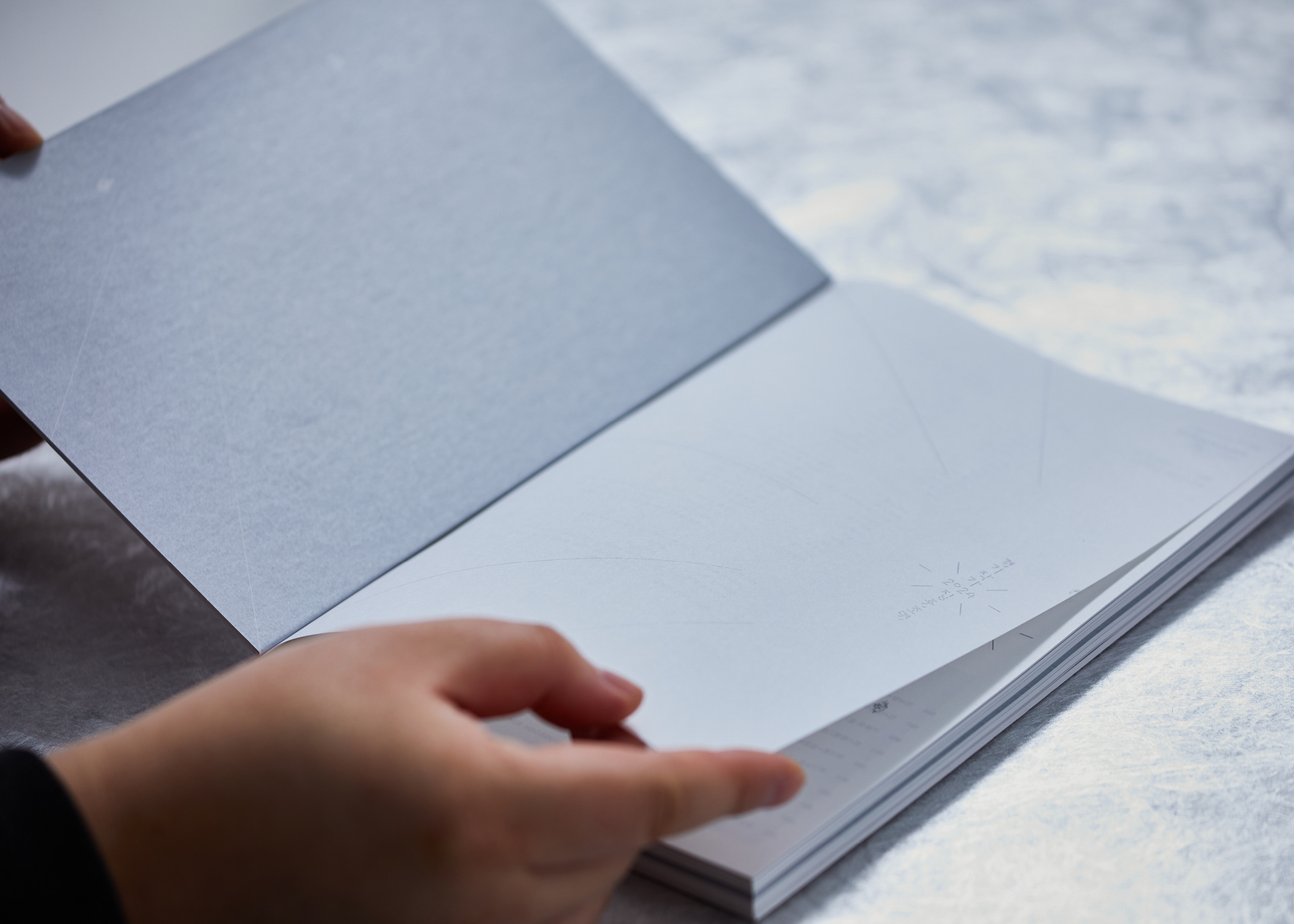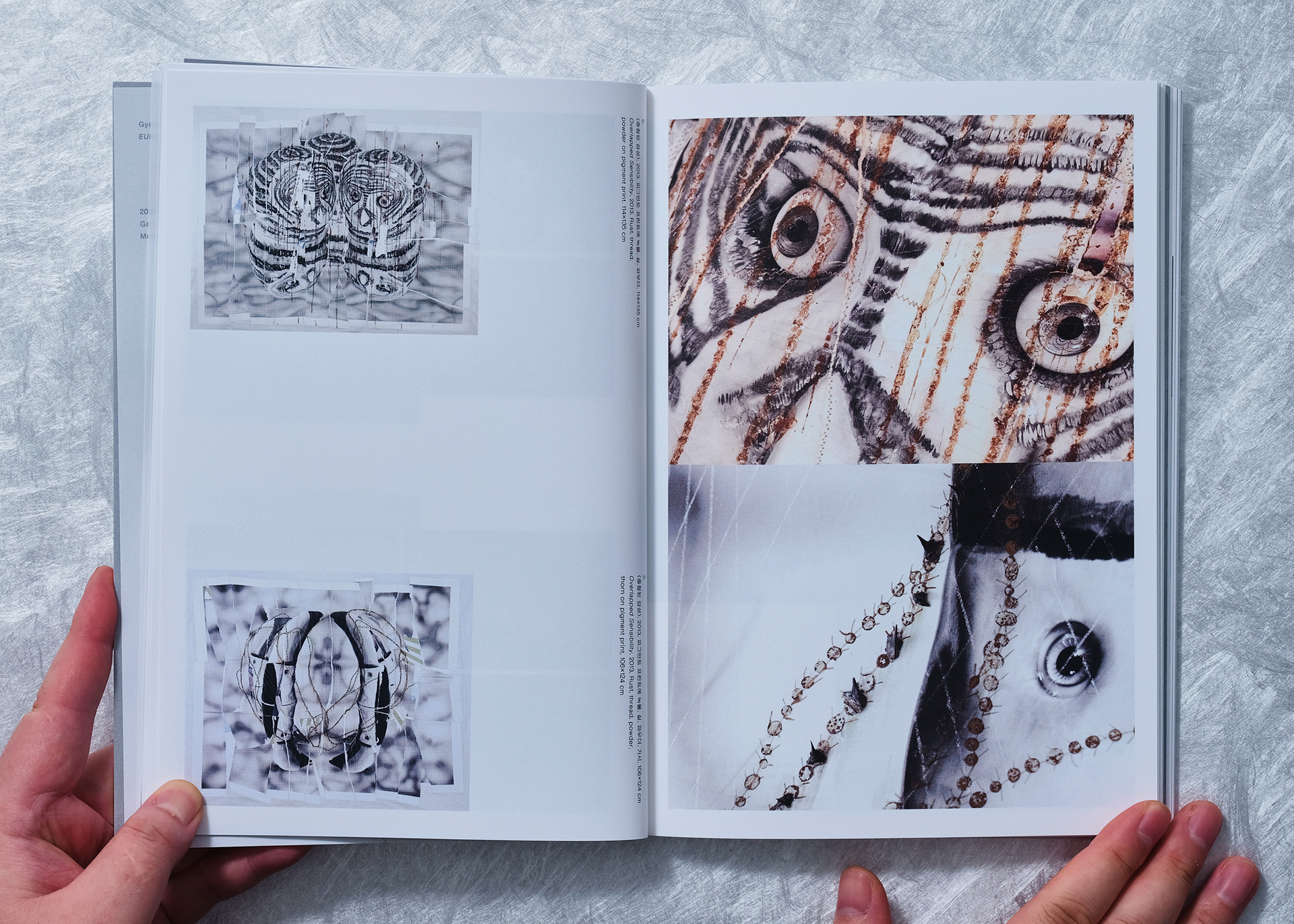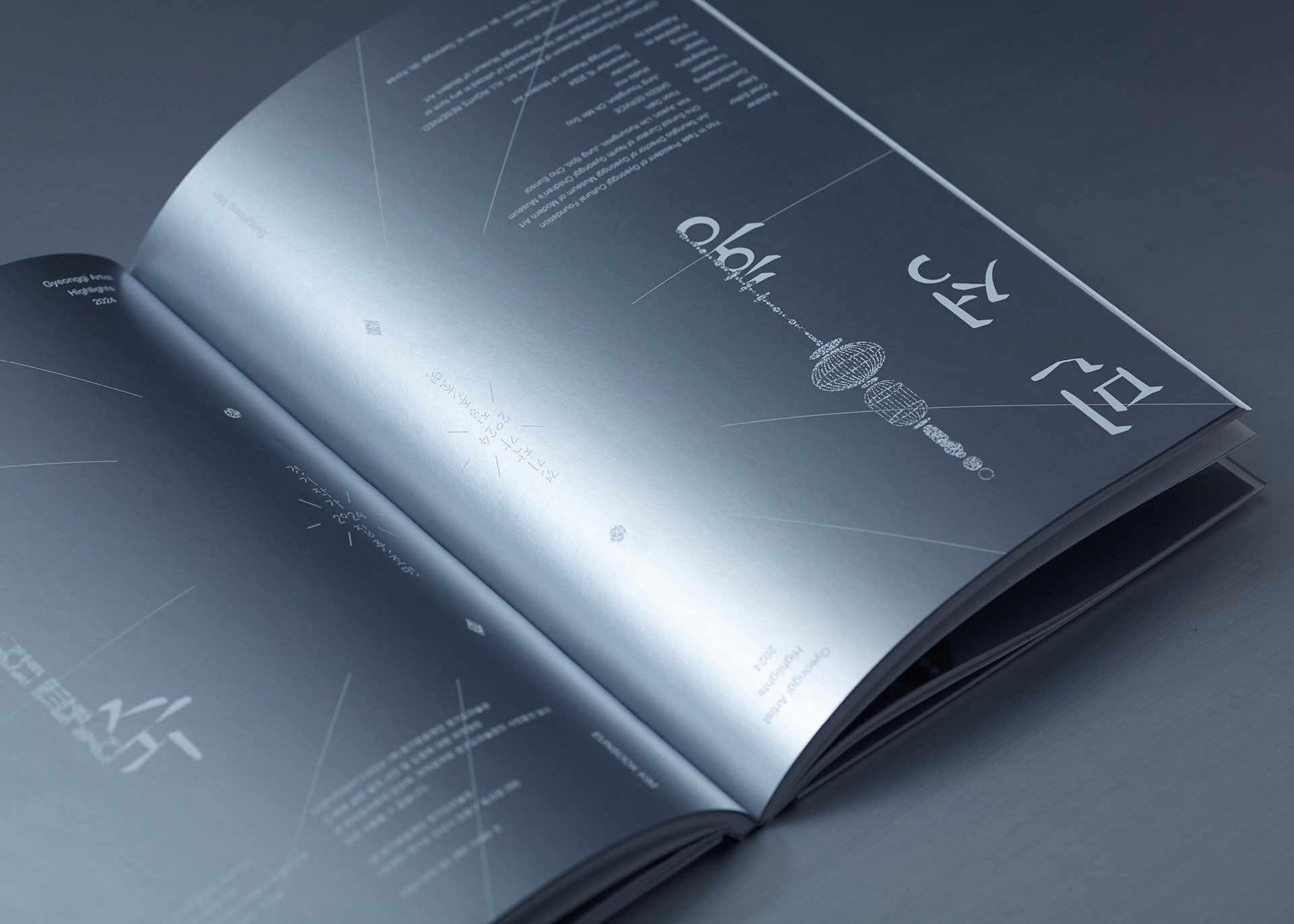 내지 인쇄 아카이브 및 텍스트 페이지는 백모조와 스노우지 등에 먹 1도와 은별색 1도를 교차 적용하고, 작품 사진 페이지는 랑데뷰지에 4도 인쇄를 적용해 정보 전달과 작품 감상의 목적에 맞게 질감을 세분화했습니다.