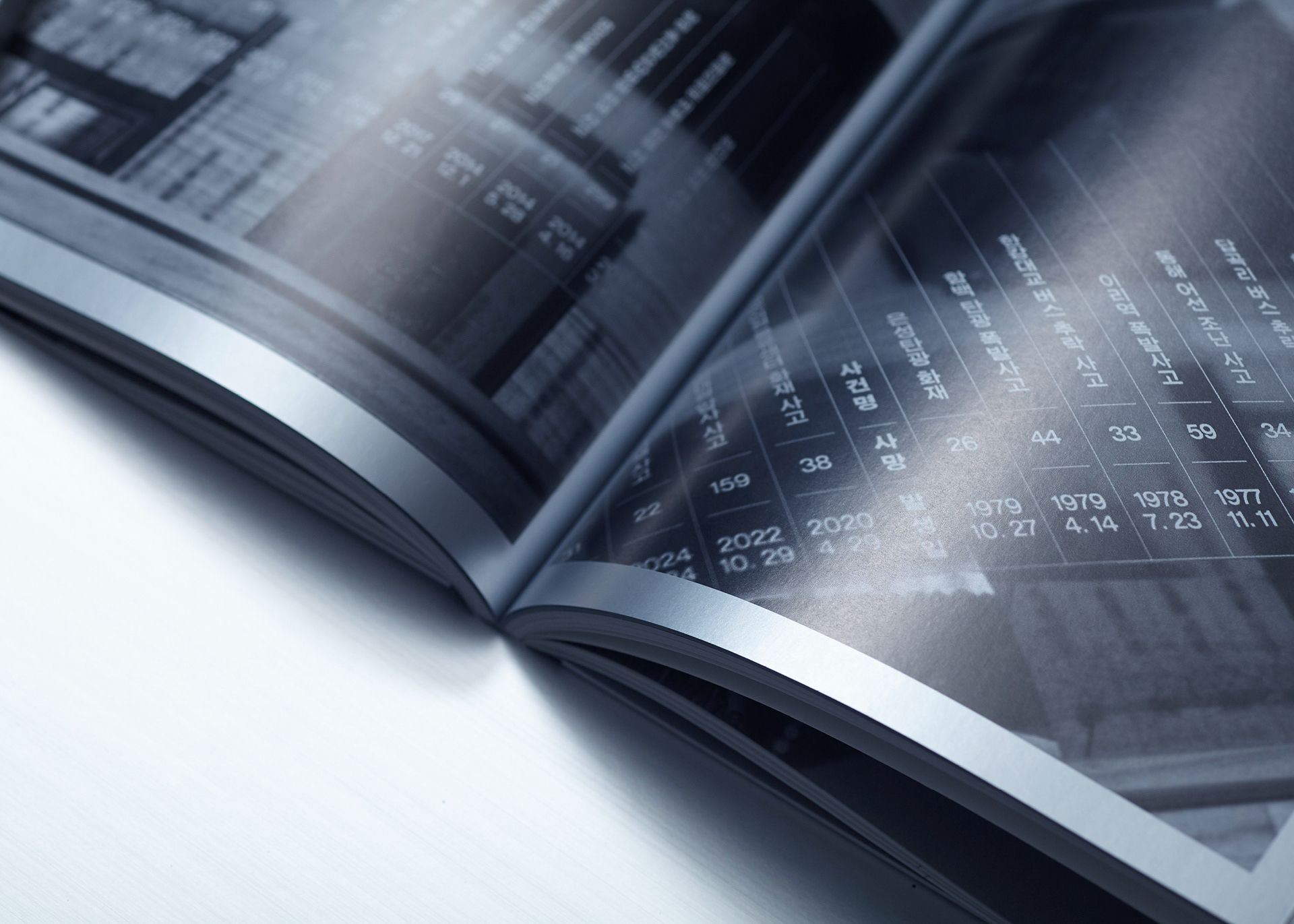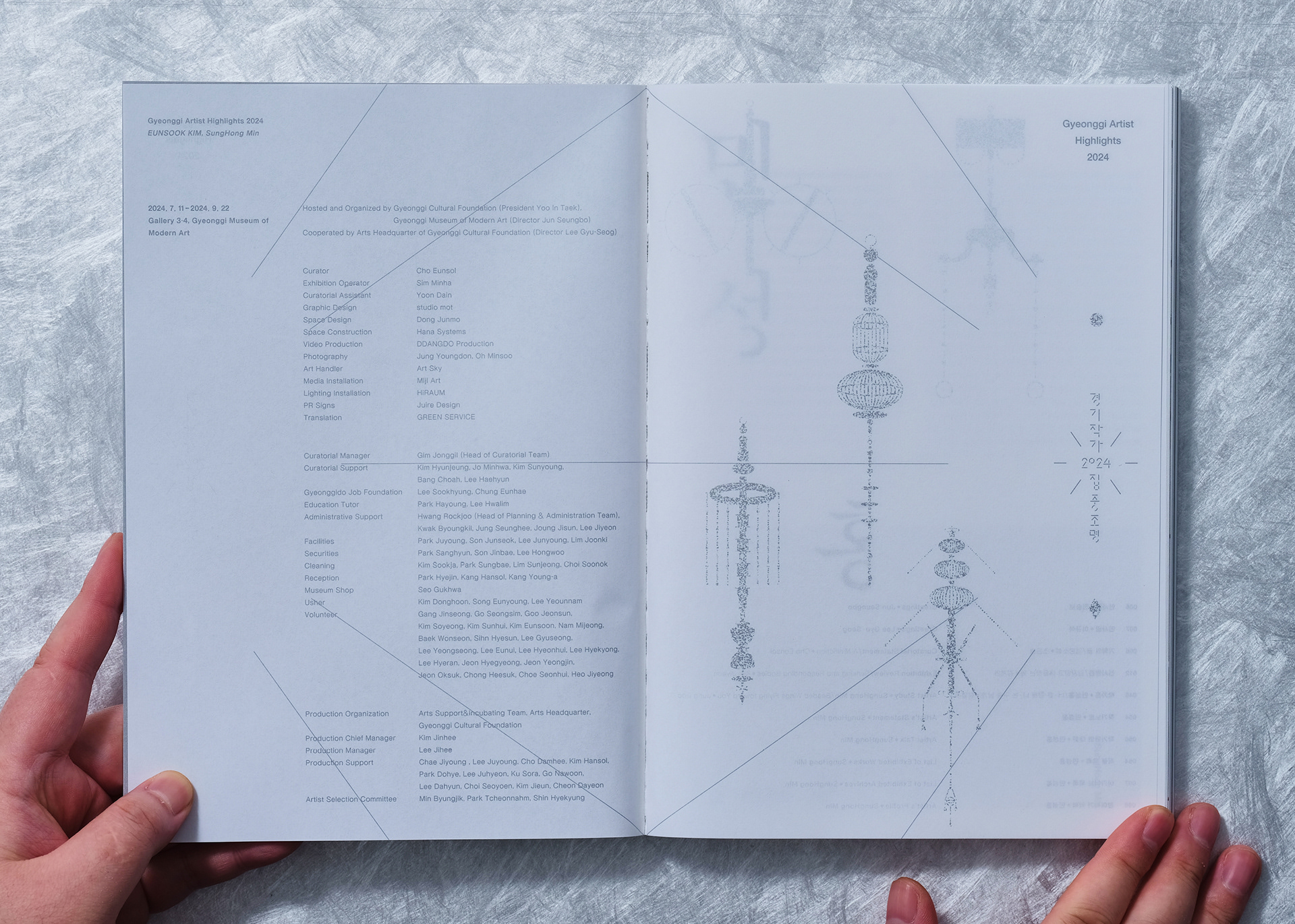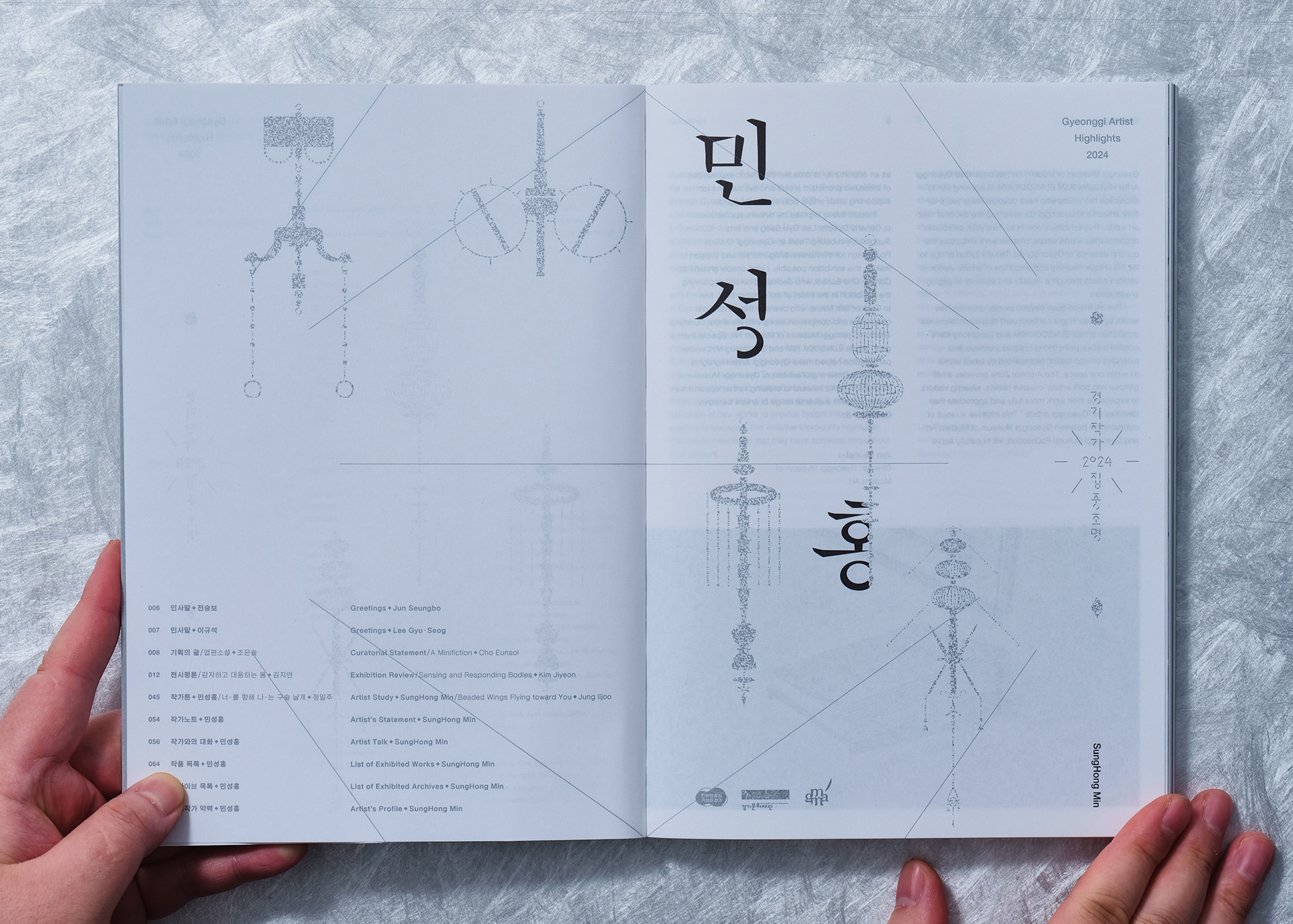 내지 인쇄 아카이브 및 텍스트 페이지는 백모조와 스노우지 등에 먹 1도와 은별색 1도를 교차 적용하고, 작품 사진 페이지는 랑데뷰지에 4도 인쇄를 적용해 정보 전달과 작품 감상의 목적에 맞게 질감을 세분화했습니다.
