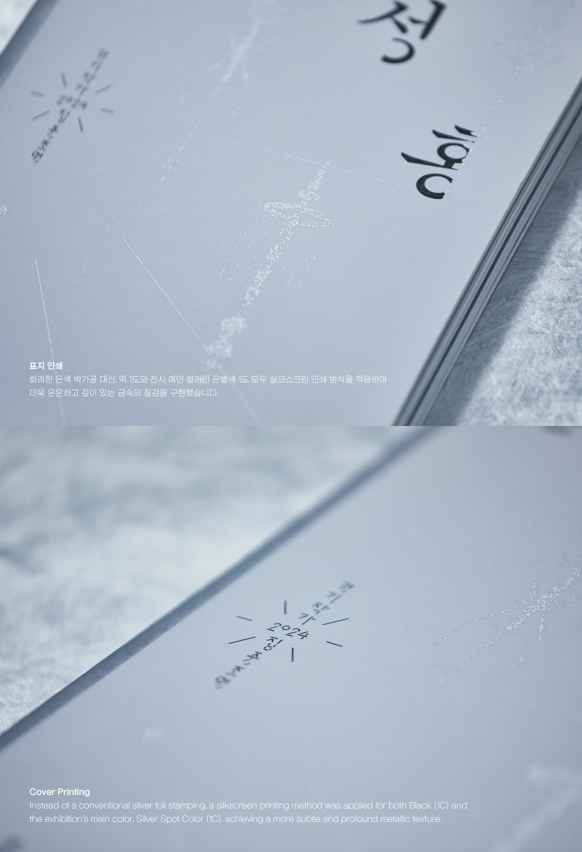 화려한 은색 박가공 대신, 먹 1도와 전시 메인 컬러인 은별색 1도 모두 실크스크린 인쇄 방식을 적용하여 더욱 은은하고 깊이 있는 금속의 질감을 구현했습니다.
