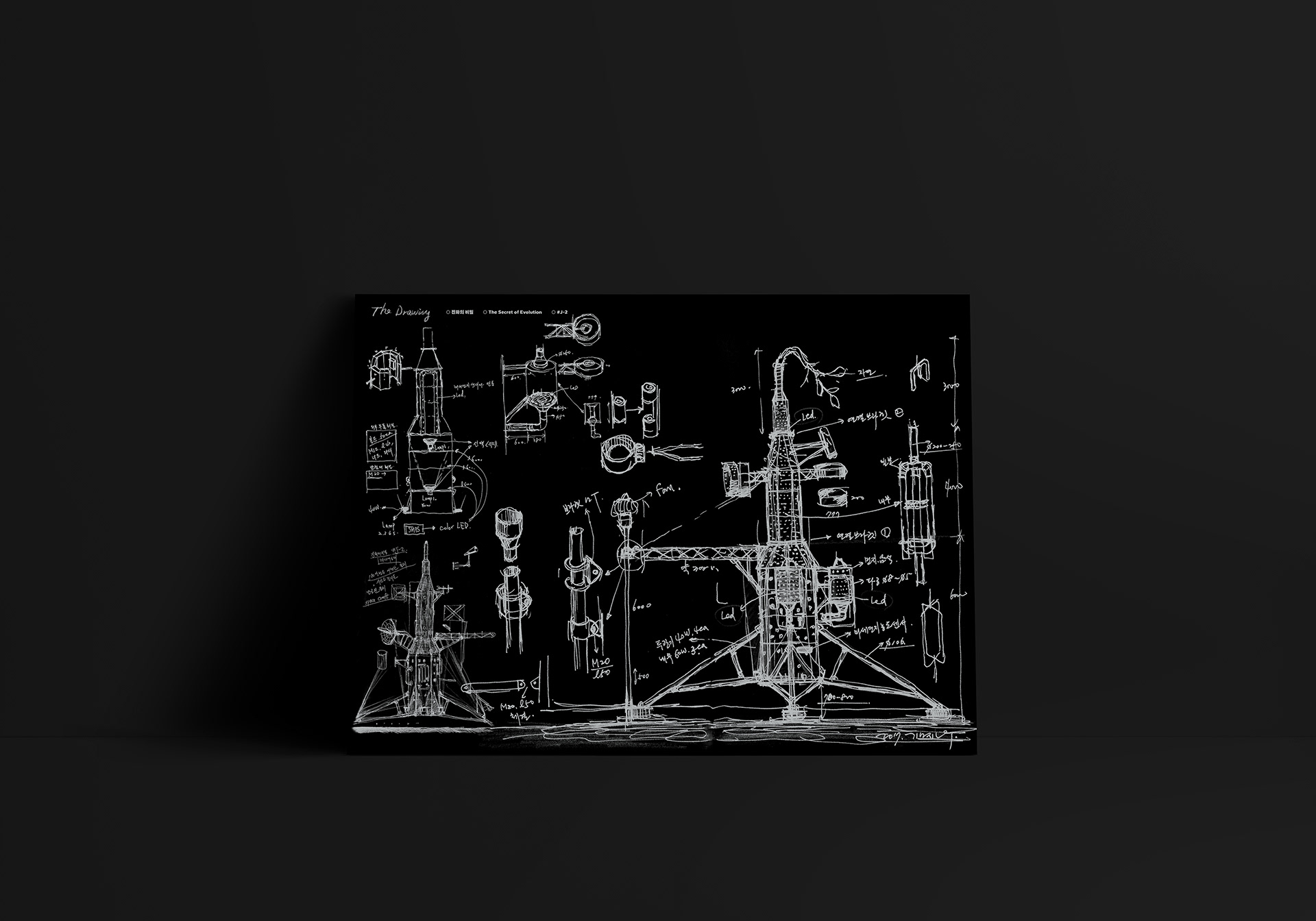 studio mot x Kim, jinwoo Collaboration Works. The Studio mot went to collaborate with the installer and engineer Kim Jin-woo, "The Drawing". As his first work, I made a posters of "The Secret of Evolution", one of the artist's 2017 works.What does drawing mean to the artist? For Kim Jin-woo, drawing is the beginning and end of all work. From the very small idea drawing to the concrete form of the work, the artist goes on to the endless drawings. The Studio mot organizes the drawings so that they can be used as a poster to symbolize the artist's drawing.